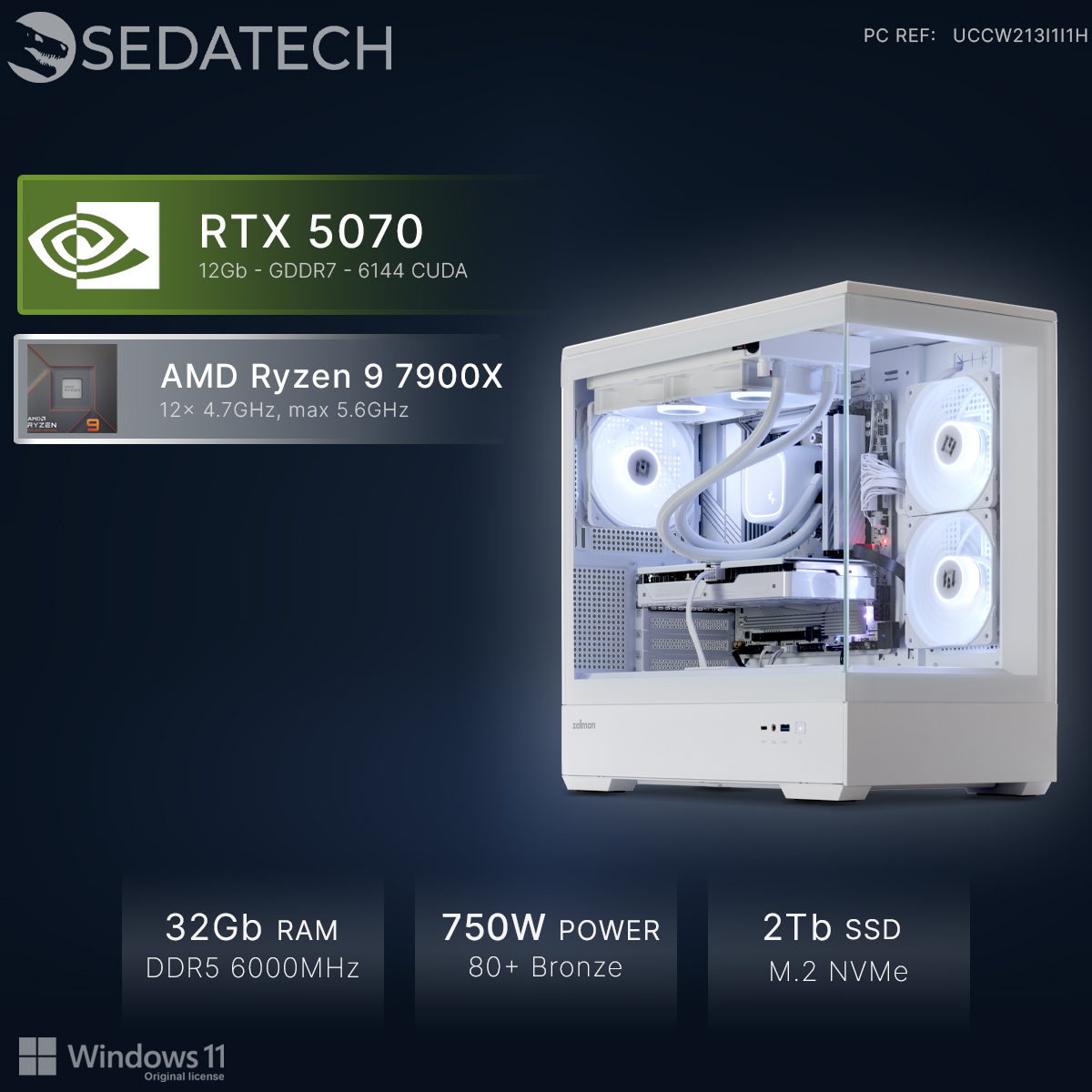 Thanks to the combination of DirectX 12 and the Geforce RTX5070 White 12Gb graphics card, one of the fastest on the market, and the astonishing 3D power of the AMD Ryzen 9 7900X 12x 4.7GHz (max 5.6GHz) CPU, you will be able to play any online multiplayer video game without graphic limitations, with breathtaking 3D effects and fluidity!