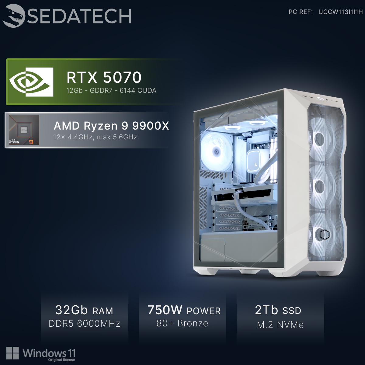 Thanks to the combination of DirectX 12 and the Geforce RTX5070 White 12Gb graphics card, one of the fastest on the market, and the astonishing 3D power of the AMD Ryzen 9 9900X 12x 4.4GHz (max 5.6GHz) CPU, you will be able to play any online multiplayer video game without graphic limitations, with breathtaking 3D effects and fluidity!