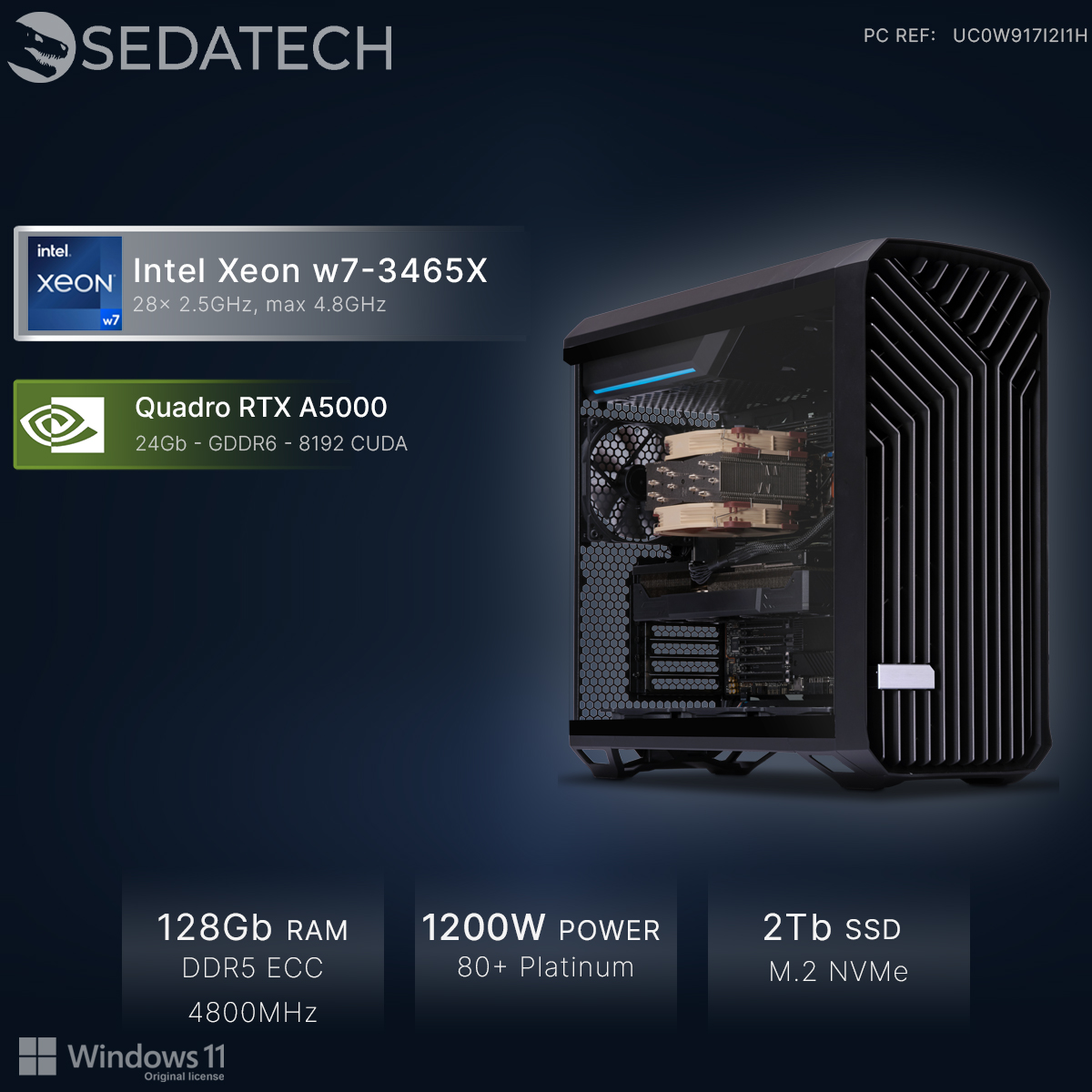 Dotado de una caja de alta calidad, la tarjeta gráfica Quadro RTX A5000 24Gb, dirigidas al sector profesional, y el procesador Intel Xeon w7-3465X 28x 2.5Ghz (max 4.8Ghz) permite el uso de muchas aplicaciones como Blender, Adobe Photoshop, Illustrator, 3ds Max, ...